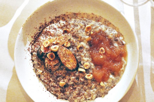 We beginnen het diner met… havermoutpap! Lekker, zo’n ontbijt om zes uur ’s avonds – het leven is zwaar als foodblogger (poe). Links een havermout met raw cacao en gekaramelliseerde banaan, rechts afgetopt met stoofpeertjes-compote. Moeilijk kiezen! Op de nieuwe winterkaart is uiteindelijk die met banaan komen te staan.