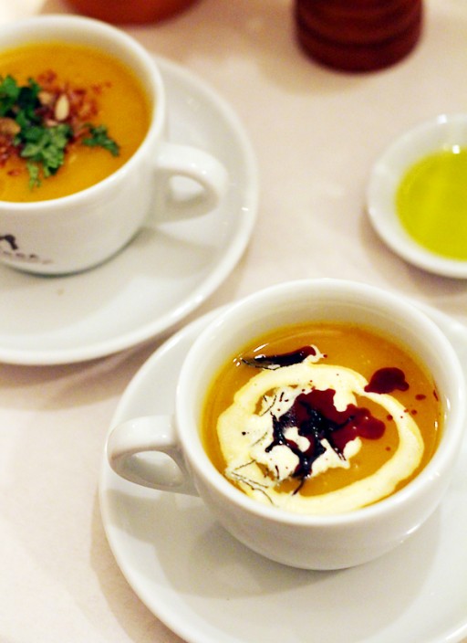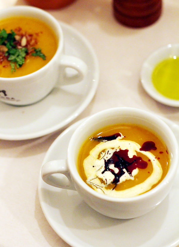 Vervolgens proeven we twee varianten op pompoensoep. Links een vegan soep met koriander en vadouvan, rechts een pompoensoep met wat room, pompoenpitolie en gefrituurde salie. De ‘winnaar’? De linker soep met vadouvan.