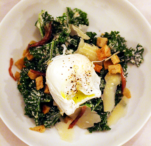 Wat een vondst: een klassieke Caesar salade, maar dan met gestoomde boerenkool als basis. Lékker! Het gepocheerde eitje maakt het natuurlijk af. Deze staat uiteraard op de nieuwe kaart!