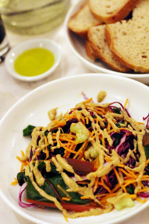 Een vindingrijk gerecht: een variatie op gado gado met zelfgemaakte pindasaus en allerlei groenten, zoals wortel, snijbiet, rode kool. Erg lekker, maar dit gerecht heeft nog wat doorontwikkeling nodig, vonden wij.