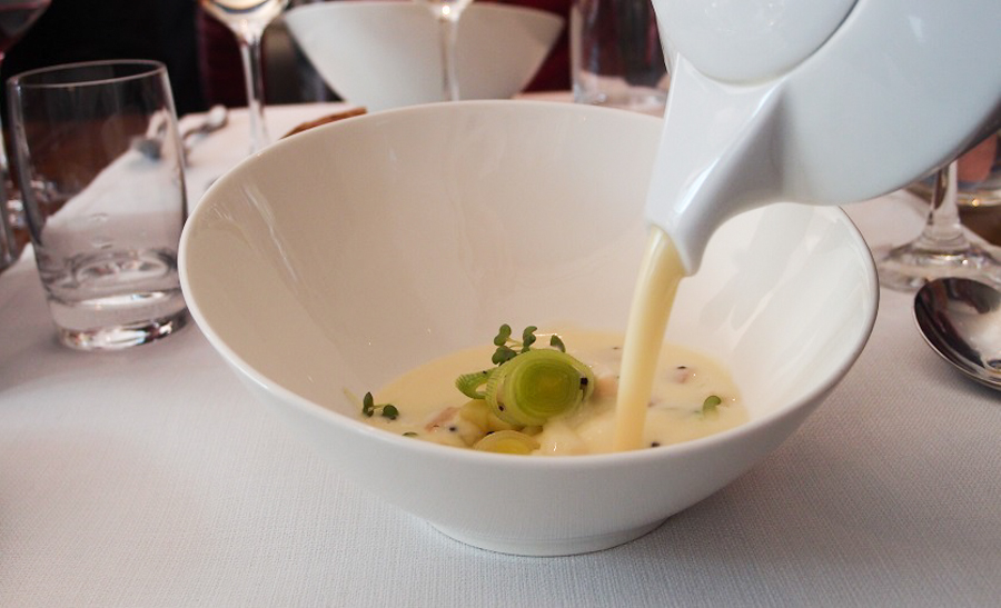 Geen nood! Wij helpen je op weg. De twee foto’s die je hieronder ziet, geven je een goed beeld van wat je kunt verwachten als je de in kersenbouillon gegaarde tamme eendenborst, met krokante dim sum, granaatappel en waldorf salade gaat bestellen en daarna overgaat op de Vichyssoise crème soep, forel en crème van mierikswortel. Wij kregen bij deze twee gerechten drie wijnen te proeven. De pinot noir die we dronken bij de eendenborst kunnen we aanraden. En bij soep schonken ze een goedpassende pinot blanc.
