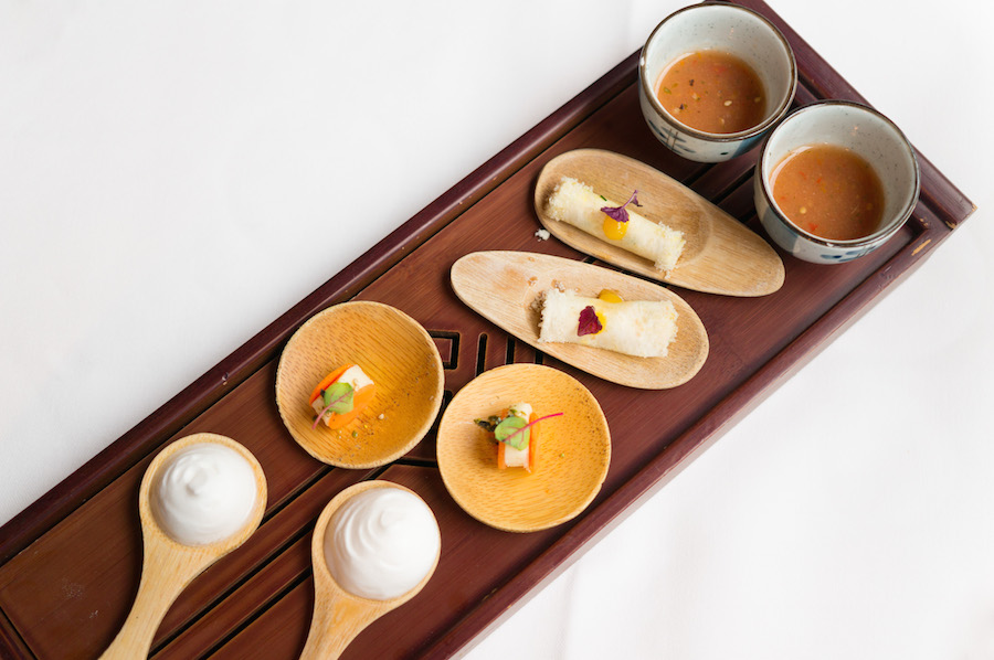 We beginnen met een plank vol bites. Een schuim van lychee met yuzu dat je smaakpapillen meteen wakker schudt. Heerlijk zachte bloemkoolcrème met wortel en pompoen.