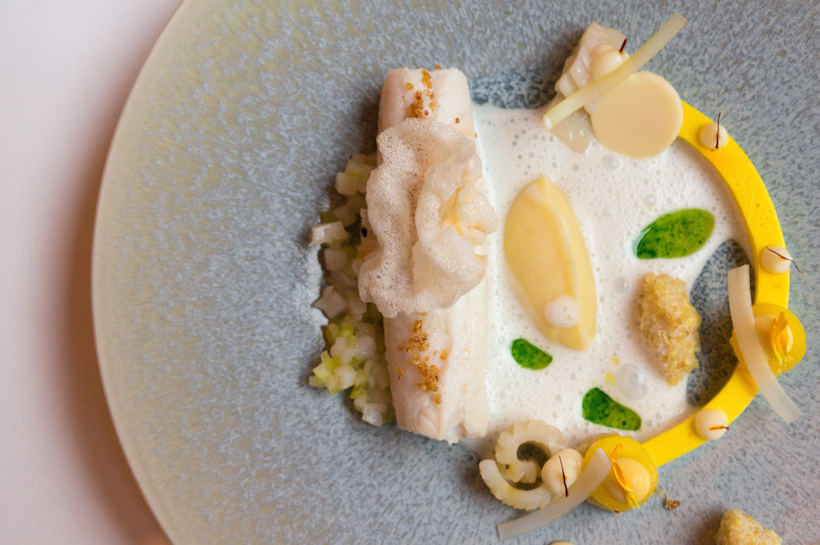Gang drie draait om de herfst: een bordje vol wit. Tong – helemaal opgerold – met daarop een kroepoek van coquille. Daarbij saffraan, sepia, quinoa, crème fraîche, bleekselderij, inktvis en een waanzinnige witte kokoscurry met olie van limoenblad.