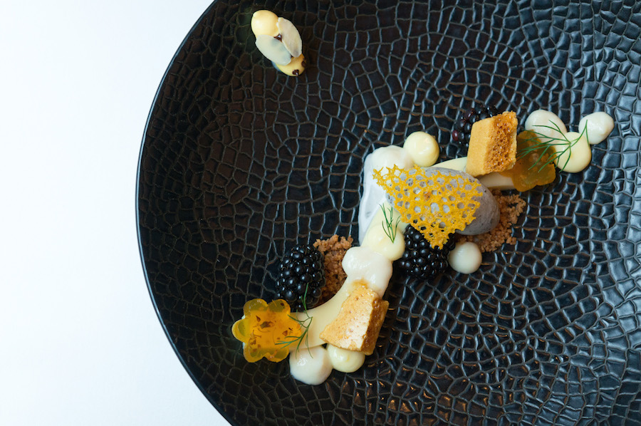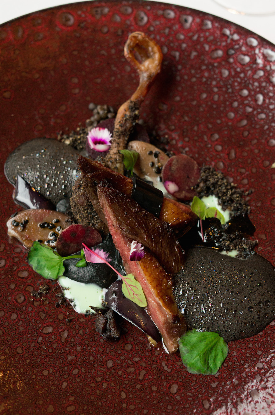 Voor de vierde gang staat de winter alweer voor de deur. Een indrukwekkend zwart plaatje met Anjou duif (de filet en de bout, compleet met pootje), sesam, schuim van wu zhi mao taò (een geneeskrachtig Chinees kruid, ook wel bekend als ‘harige vijg’), zwarte olijf, aubergine en eendenmaagjes.