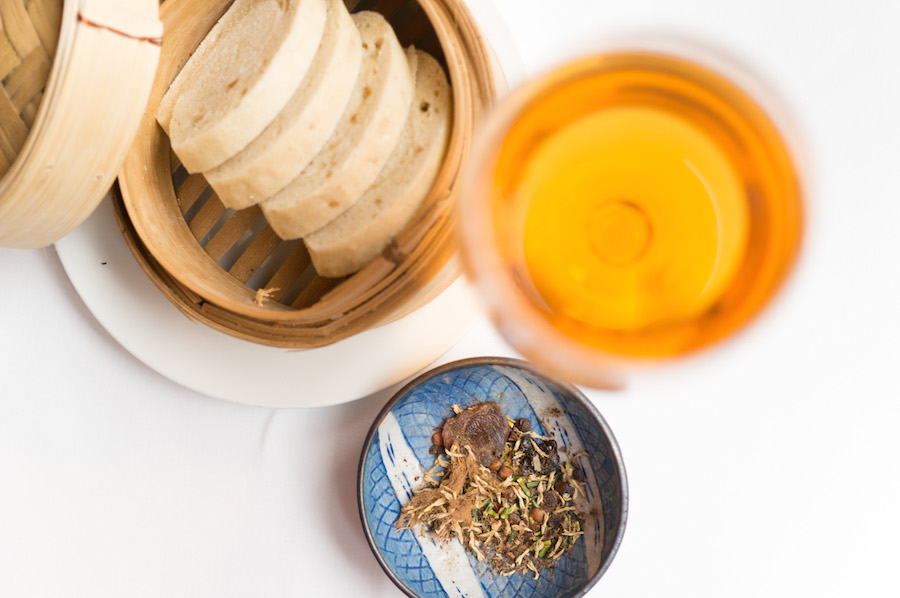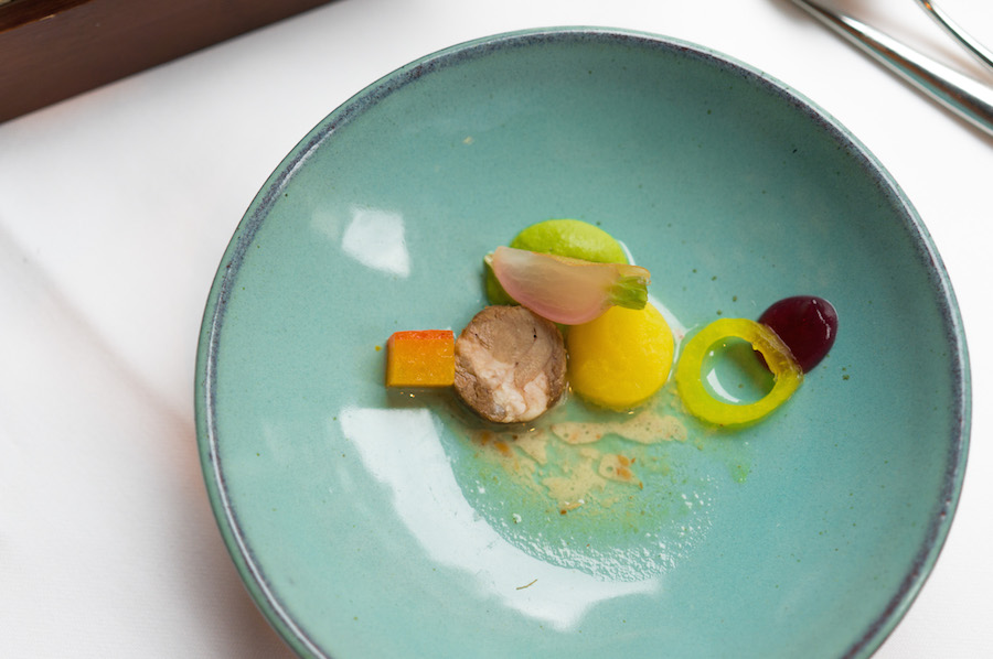 De amuse bevat onder andere sukade van kalf, puree van doperwt, sjalot en gele biet. Ontzettend lekker. Op tafel verschijnt ook een stoommandje met gestoomd brood met sjalotjes erdoorheen.