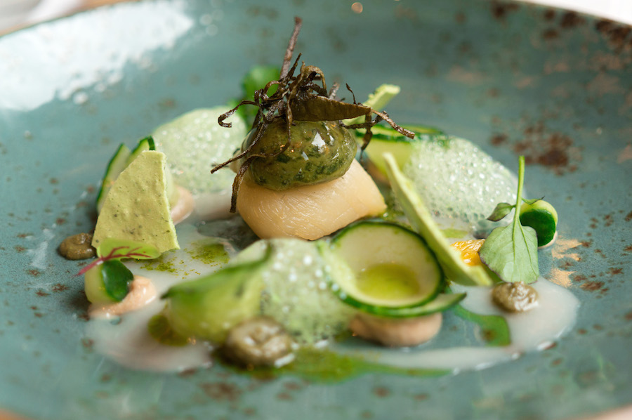 Tijd voor de eerste gang: het wordt lente op tafel met een bord vol groen. De ster op het bord is de dry-aged (!) coquille. Daaromheen miso-shiso pesto, eendenlever, tamarinde, frisse komkommer en schotsen van zeewier-meringue.