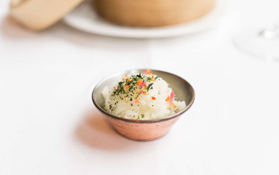 Na de eerste gang krijgen we nog een appetizer van kleefrijst met crème fraîche en kruiden om onze smaak te neutraliseren.