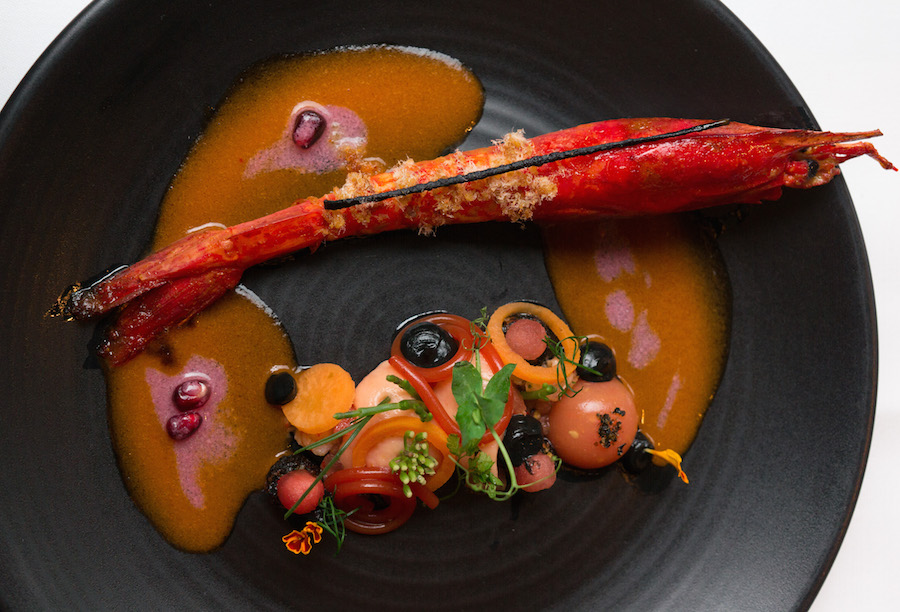 Dan door naar het tweede gerecht: zomer. Een bord vol rood knalt ons tegemoet. De beauty op het bord is een enorme knalrode tijgergarnaal. Die wordt gezelschap gehouden door een saus van tomaat en granaatappel, gelei van tomaat en basilicum, watermeloen en avocado.