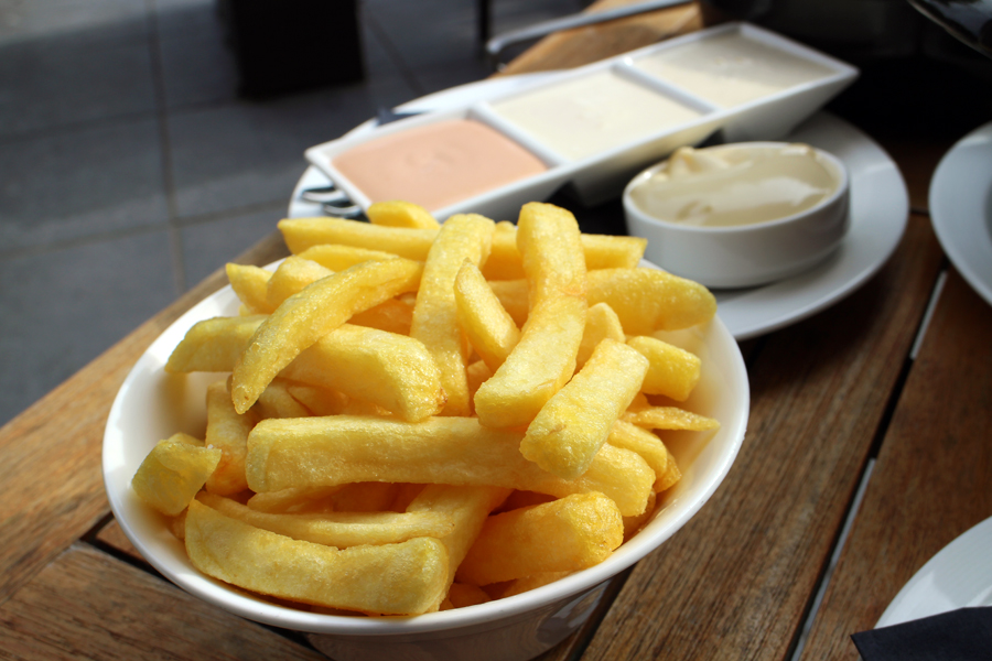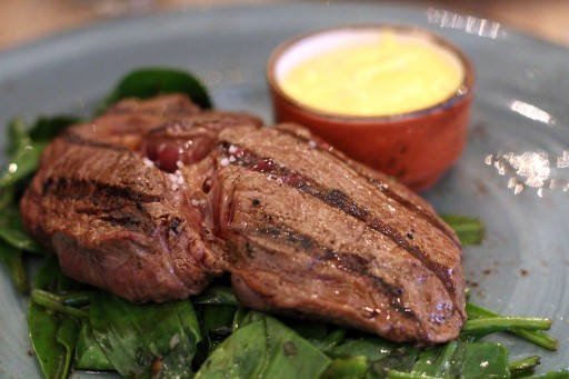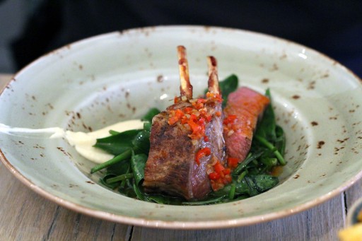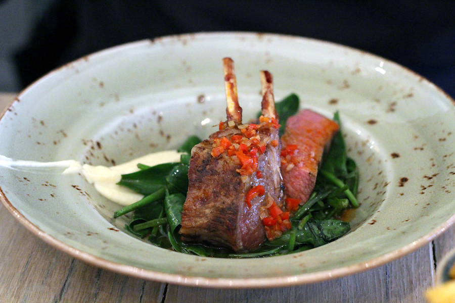 Na alle vis van deze dag gaan we als hoofdgerecht voor vlees: rib-eye met béarnaisesaus en lamsrack met knolselderijpuree. Beide gerechten worden geserveerd met frietjes (mwoah), salade (prima) en gebakken lamsoor (heerlijk zout en perfect bij het vlees). Beiden komen uit de Big Green Egg; of dat een succes is, is geheel persoonlijk. Wij vinden deze hippe barbecue een leuk apparaat, maar de rooksmaak overheerst al gauw in het gerecht. Dat is de eerste hap leuk, maar daarna wordt het helaas ’n eentonige smaak. Ook zonde van het vlees, want dat is van topkwaliteit. De garing is prima.