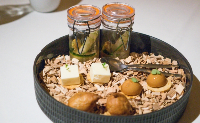 De amuse bestaat bijvoorbeeld uit een klein weckpotje, gevuld met kombucha (gefermenteerde zwarte thee), mossel, peer en lenteui.