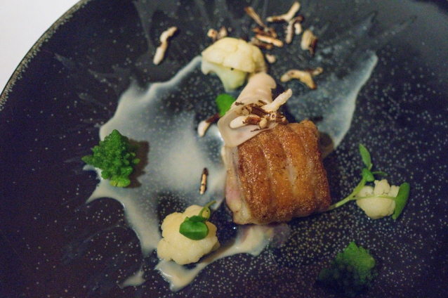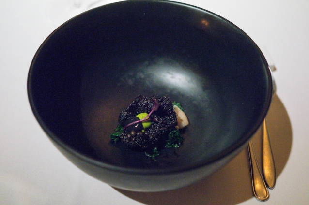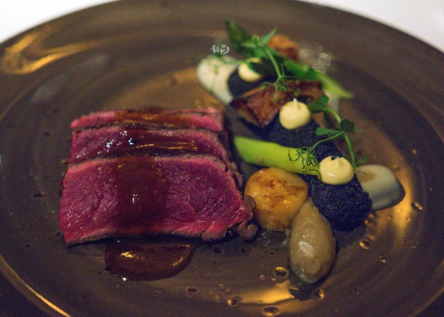 We zijn nog niet klaar: we krijgen nog Black Angus-beef met een jus van Szechuanpeper en rode wijn, een krokante zwarte pomme dauphine, groene asperge, paddenstoel en aardpeer.