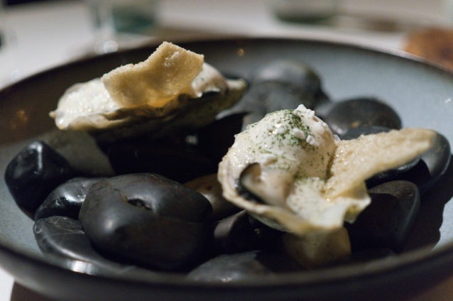 We gaan door met drie bereidingen van oester: rauwe oester met een schuim van oester en een krokantje van oester. Daarbij zeealg en yoghurt.
