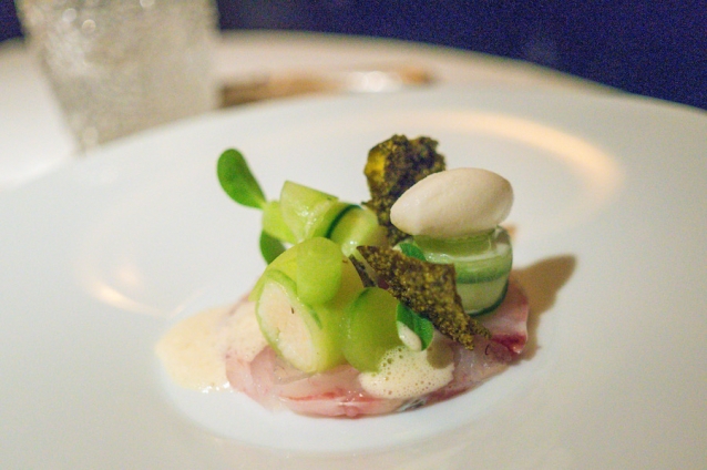 We vervolgen onze maaltijd met een ceviche van zeebaars met komkommer, schuim van mierikswortel en wederom iets krokants.