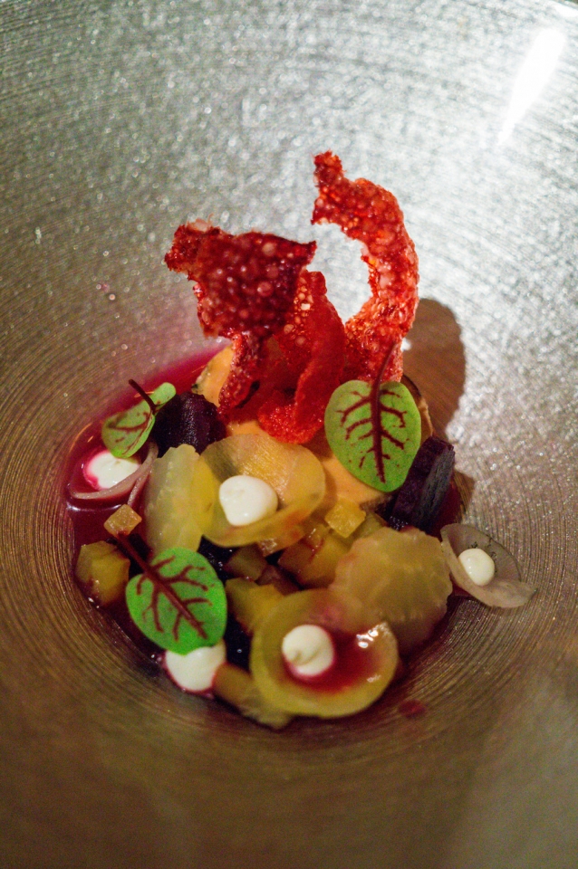 Met een big smile beginnen we dan ook aan het volgende gerecht: biet en eendenlever met gefermenteerd bietensap. Fantastisch.