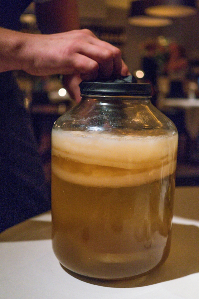 Tussendoor spreken we nog even met de chef en zijn we vooral benieuwd naar het verhaal achter de kombucha, die hij als amuse serveerde. Patrick maakt alle vinaigrettes zelf en de kombucha dus ook. “Niet veel chefs beginnen daaraan, omdat je dit echt vijf maanden vooruit moet plannen”, aldus de chef.