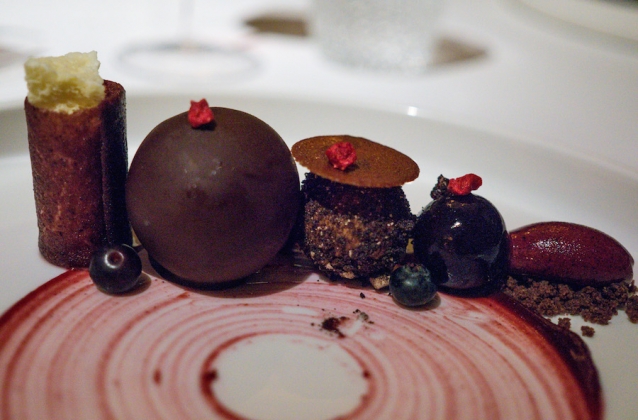 We sluiten af met rode wijn met bubbels (!), heel feestelijk, en een compositie van chocolade en bosbes. Zalig is het grootste chocoladebolletje op ons bord, gevuld met een soort marshmallow met bosbes en een laagje krokante chocolade.