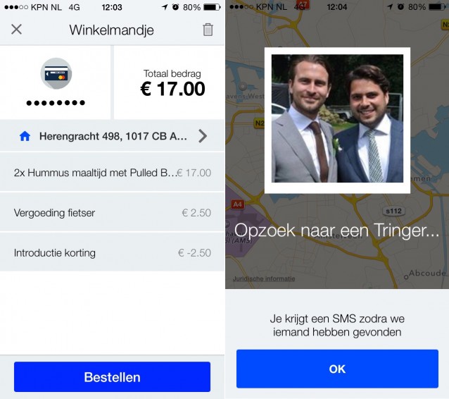 Het plaatsen van de order is binnen een paar seconden gepiept, en werkt à la Thuisbezorgd.nl. Een verschil is dat na het bestellen er pas gezocht wordt naar een ‘Tringer’; iemand die op de fiets stapt naar de afhaalplek en jouw adres.