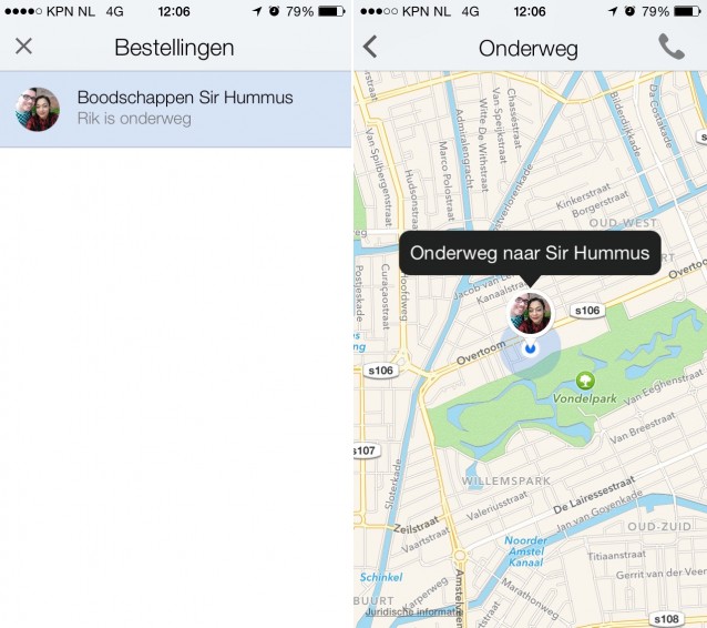 Om 12.04 doen we onze bestelling, om 12.06 wordt Rik als Tringer bevestigd. Om 12.22 krijgen we een sms dat hij er ‘over 8 minuten’ is, mét het 06-nummer van Rik (dat is handig, want dan kunnen we hem alsnog laten weten welke bel hij moet hebben).