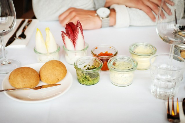 Voordat we het menu geserveerd krijgen, doen we ons tegoed aan de huisgebakken broodjes met verschillende zelfgemaakte tapenades en boters. Erg lekker.