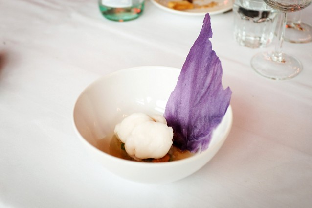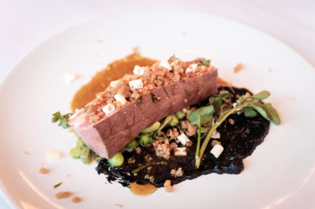 Vervolgens een mooi tussengerecht van zacht gegaarde zeeduivel met aardpeer, snijboon en een dashikoffiebouillon. Mooi dat de koffietonen van het voorgerecht hier subtiel in worden doorgetrokken.