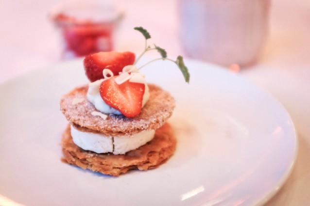 Als dessert wordt ons een klassieker voorgeschoteld: aardbeien à la Romanoff. Heerlijke zomerkoninkjes met gezoete room, tussen twee gesuikerde koekjes.