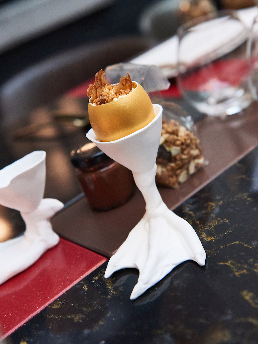 Fantastisch zijn ook de eitjes: gepocheerd ei met cèpes Hollandaise (met eekhoorntjesbrood) en krokante eitjes met paling. Er komt zelfs nog loeilekkere bloedworst met appelcompote op tafel en we sluiten af met een goud geverfd eitje, gevuld met gemarineerde ananas met karamel, drop, yuzu, schuim van advocaat en chips van kippenhuid.