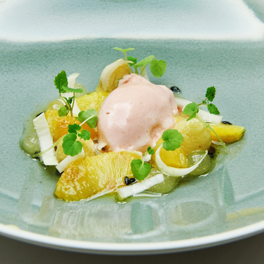 Het dessert bestaat uit sorbetijs van bloedsinaasappel met witte chocolade, passievrucht en rauwe witlof (!), dat ook in het restaurant wordt geserveerd. Thérèse heeft ook bij elke gang een bijpassende wijn uitgezocht.