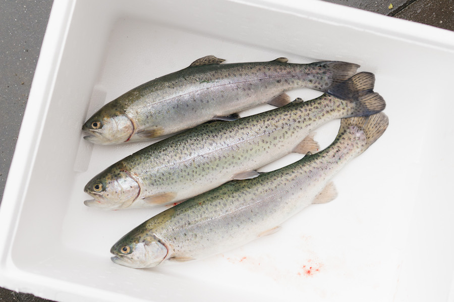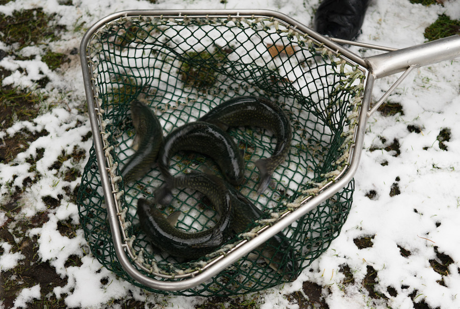 We mogen zelf vissen naar beekforel en omdat de vissen hier nooit worden teruggeworpen na de vangst, gaan ze direct mee naar het restaurant. Ermee koken kan nog niet meteen; verse vis is vaak nog té vers om direct mee te koken (fileren lukt dan nog niet). Daarom gaan we aan de slag met forellen die gisteren al zijn aangeleverd bij De Librije.