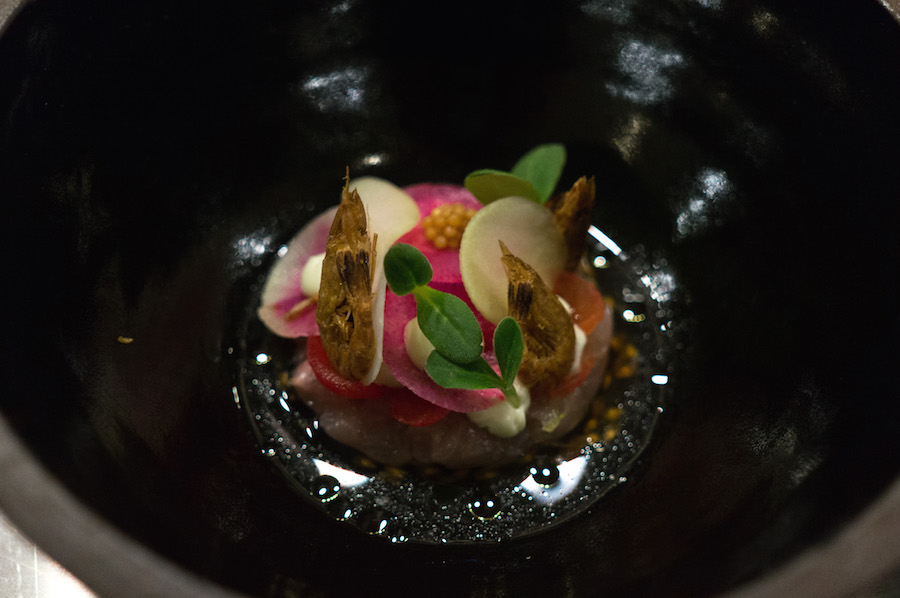 Met z’n twaalven gaan we aan de slag om een driegangenlunch te bereiden. Onze ploeg ontfermt zich over het voorgerecht: tartaar van rauwe saibling (forel) met tomaat, limoenblad en garnaal.