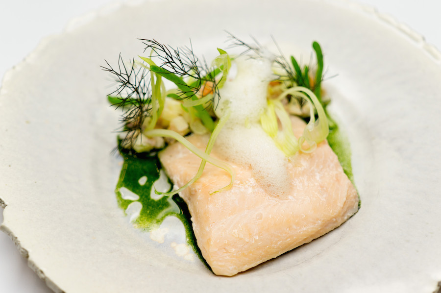 De andere teams maken de daaropvolgende gerechten, beginnende met een hoofdgerecht van sous-vide gegaarde witte forel met paling, venkel en citroengras. Doordat de vis sous-vide is gegaard, zijn alle smaken binnengebleven en is -ie heerlijk mals en sappig.