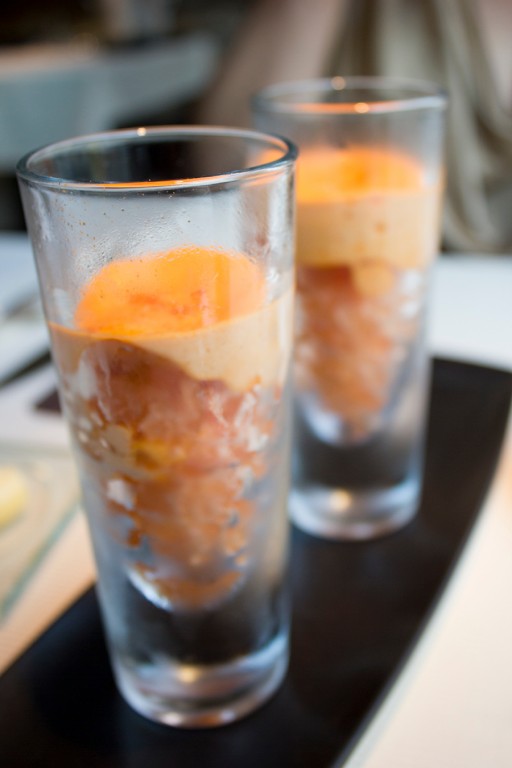 Vanavond hebben we gekozen voor een ontdekkingsreis van vijf gangen met wijnarrangement, en starten met een aantal bedankjes van de chef bestaande uit twee amuses. Onze ober verklapt alvast dat een vijfgangen menu bij Costes méér zal zijn dan wat we verwachten.