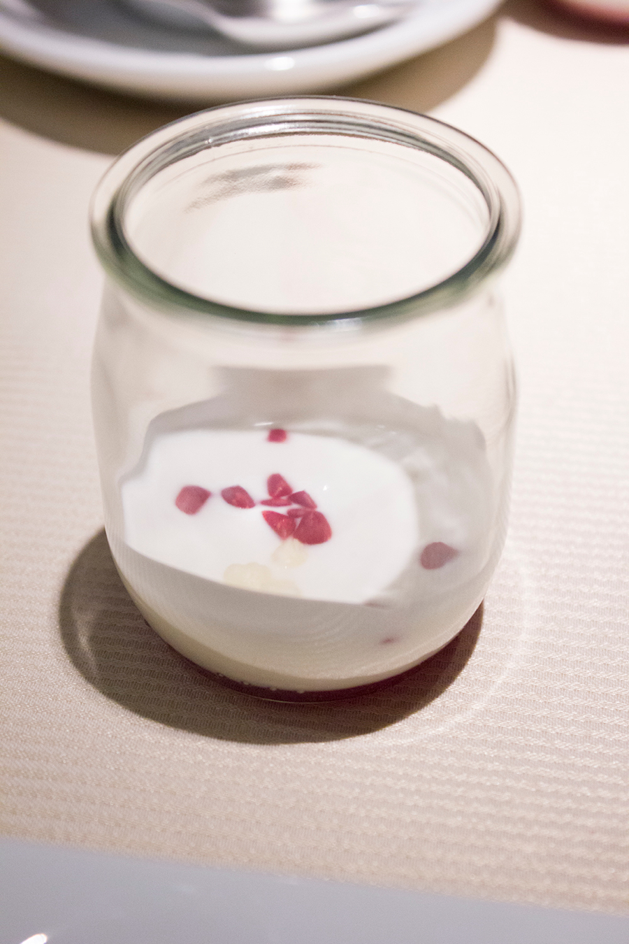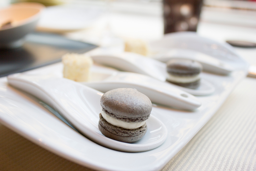 De tweede gang amuses bedekt de gehele tafel met vier verschillende gerechtjes. Op twee amuselepels liggen grijze mini-macarons met een vulling van zachte geitenkaas en een marshmallow blokje met een korst van amandel. Daarbij krijgen we een kommetje met broccoli-mousse met daarop kaviaar en een bekertje zout-zoete melk.