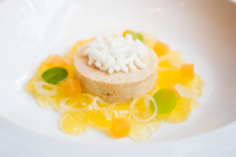 De eerste echte gang is foie gras met meloen en lente-ui. Dit gerecht laat zien waar culinair Hongarije naast goulash bekend om staat: eendenlever. In Nederland is de productie verboden, in Hongarije niet en daardoor is deze lever op bijna elke straathoek verkrijgbaar. De ideale combinatie is om lever met iets zoets te eten, vandaar de meloen. Deze is gepresenteerd in twee verschillende bereidingen: als gelei en als stevige blokjes. Bovenop de de eendenlever liggen gepofte stukjes rijst die voor structuur zorgen in het anders zachte gerecht. Ook krijgen we een heerlijk huisgebakken stukje brood. Bij dit gerecht wordt een glas friszoete landgoed wijn uit Tokaj geserveerd, een bekende Hongaarse wijnstad, die net als de meloen een mooi contrast vormt met de eendenlever.