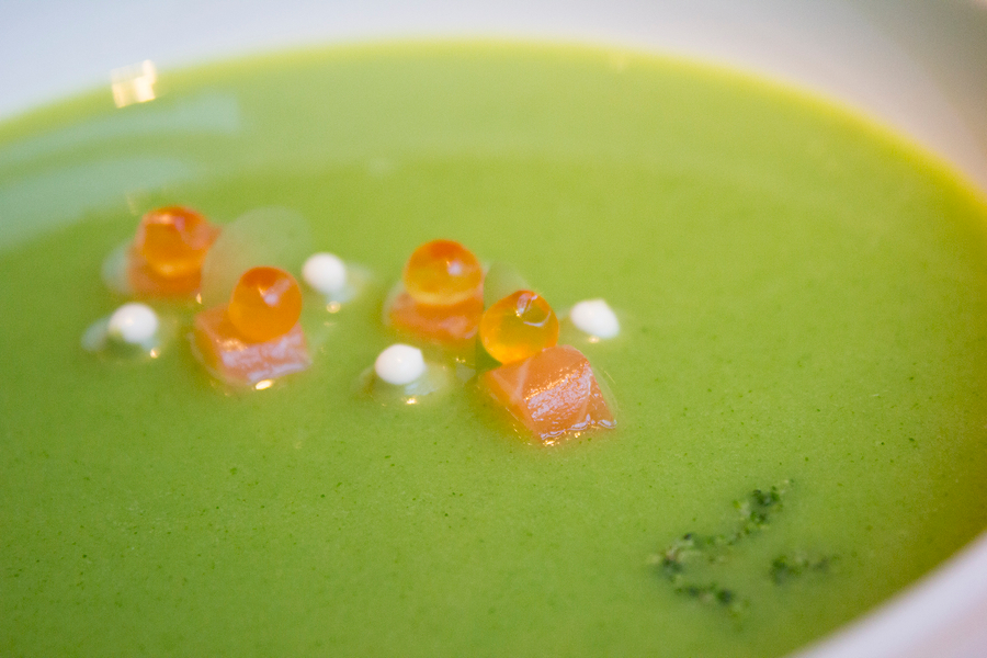 Bij de tweede gang wordt de magie van Costes duidelijk. We krijgen een diep bord met daarop acht prachtige torentjes van crème fraîche en zalm, met daarop zalmkaviaar. Aan tafel wordt vervolgens door de obers broccoli soep over deze torentjes gegoten.