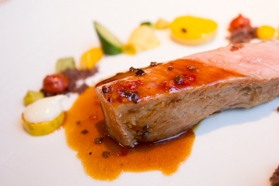 Het hoofdgerecht is een sappig gebakken stukje langzaam gegaarde lamshaas met daarom heen verschillende bereidingen van courgette, geitenkaas en tomatenpuree. Over de lam gaat een mooie lepel jus van tijm en peperkorrels. De wijn die bij dit gerecht wordt geschonken komt ook uit Tokaj en is vernoemd naar een belangrijke straat die uitkomt op de hoofdweg van Boedapest. Izabella utca is naast een prachtige straat dus ook nog eens een heerlijke vrij zoete rode wijn die in een grote kelk wordt geserveerd waardoor hij veel lucht krijgt. In combinatie met de wat zurige geitenkaas en malse lamsvlees is dat ontzettend lekker.