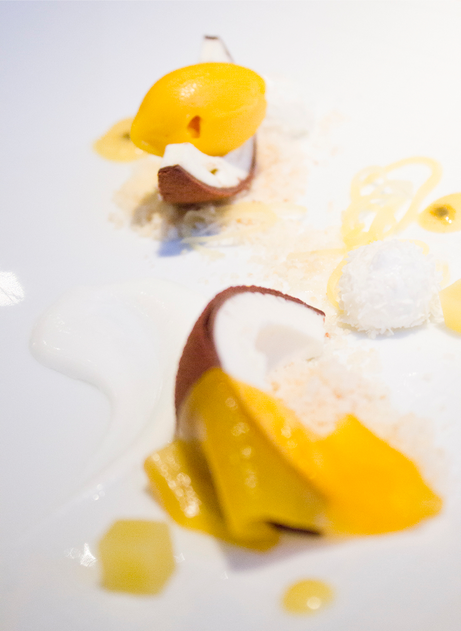 Bij het menu wat we hebben gekozen zitten maar liefst twee desserts. Het eerste dessert is een compositie van kokosmousse in een schil van chocolade, een streep limoen-yoghurt, een quenelle van mango-ijs, een kleine kokosmeringue en vanille- passievruchtsaus. Daarbij een heerlijk gemarineerde julienne van gember en een lint mango- gelei. Het zijn zoveel verschillende componenten dat je niet weet waar je moet beginnen. De prachtig nagemaakte kokosschil durven we bijna niet kapot te maken met onze lepel, maar is heerlijk in combinatie met iets friszurig zoals het mango-ijs of passievrucht.