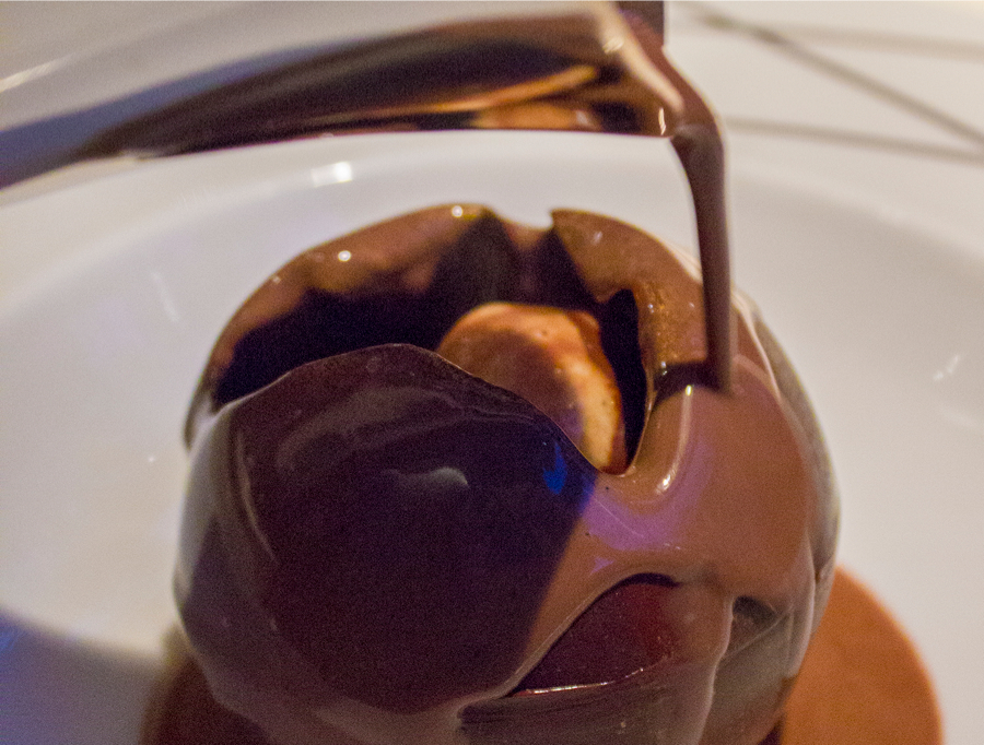 Door warme fluweelzachte chocoladesaus over het ei te gieten toont de ober ons op verrassende wijze de inhoud: bestanddelen van een klassieke Poir Belle Hélène. Zachte peertjes, warme chocoladesaus, een bolletje kaneelijs en noten crunch.