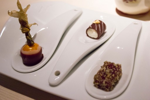 De chef bedankt ons nog met een extra laatste gang: een palet van regionale producten waaronder zachte yoghurt met aardbeiensaus en gedroogde stukjes aardbei bovenop in een prachtig glazen potje. Op drie amuselepels een kubus van pompoengelei bedekt met een korst van pompoenpitjes, een oranje kers met fondant, en een eigen versie van een Túró Rudi. Dat laatste is een traditioneel Hongaarse snoepje, een rolletje roomkaas met een laagje chocolade. Bij Costes leggen ze daar ook nog wat bladgoud bovenop voor de finishing touch.