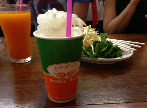 Dat laatste is bij Thip Samai absoluut het geval. Je kunt overigens niets anders bestellen dan de Pad Thai. 34 Baht (nog slechts €0,90!) voor Pad Thai zonder ei, 70 Baht (€1,85) voor de Pad Thai met ei. Wauw. Erbij drink je overigens water, jus d’orange of kokoswater. Vooral die laatste is goddelijk; zo romig dat het een milkshake lijkt.