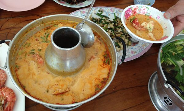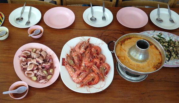 Ik had een heerlijke middag bij restaurant Dang in de provincie Samut Songkram, een halfuurtje rijden van Bangkok. Hier genoot ik van de meest lekkere traditionele Thaise (vis)gerechten, in overvloede geserveerd. Vooral erg goed waren de soepen (Tom Yum Kung) en het krabvlees met zwarte peper en knoflook.