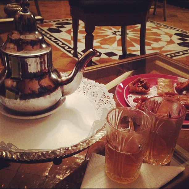 De klassieke zoete Marokkaanse thee, gemaakt van munt, is natuurlijk de basis bij elke maaltijd van de dag. De thee wordt geserveerd in een prachtige Marokkaanse theepot met tuit (ook wel Berrad genoemd). Allereerst heb je een bos verse munt (Nanaa) nodig, een flinke eetlepel groene thee en veel suikerklontjes.