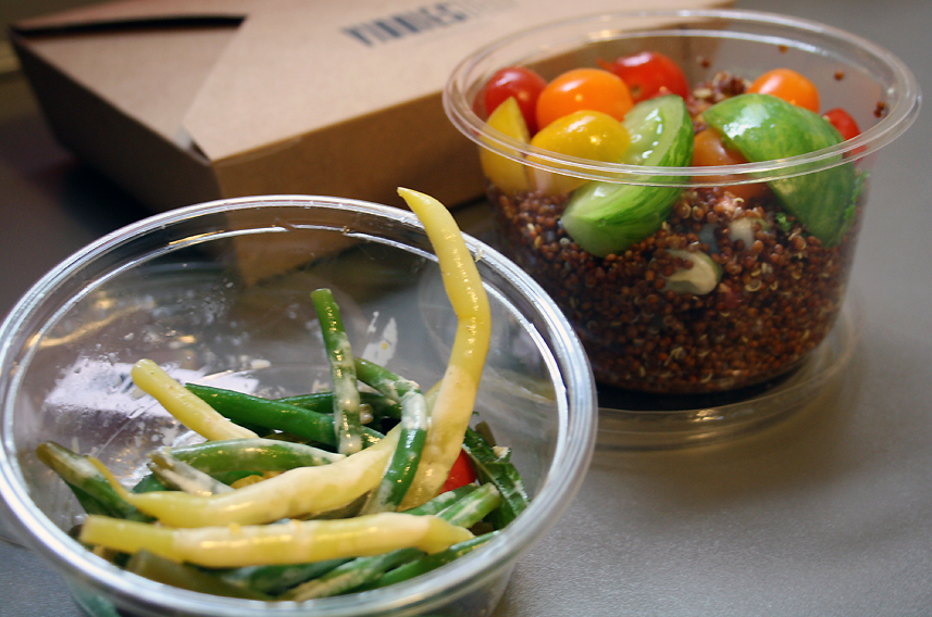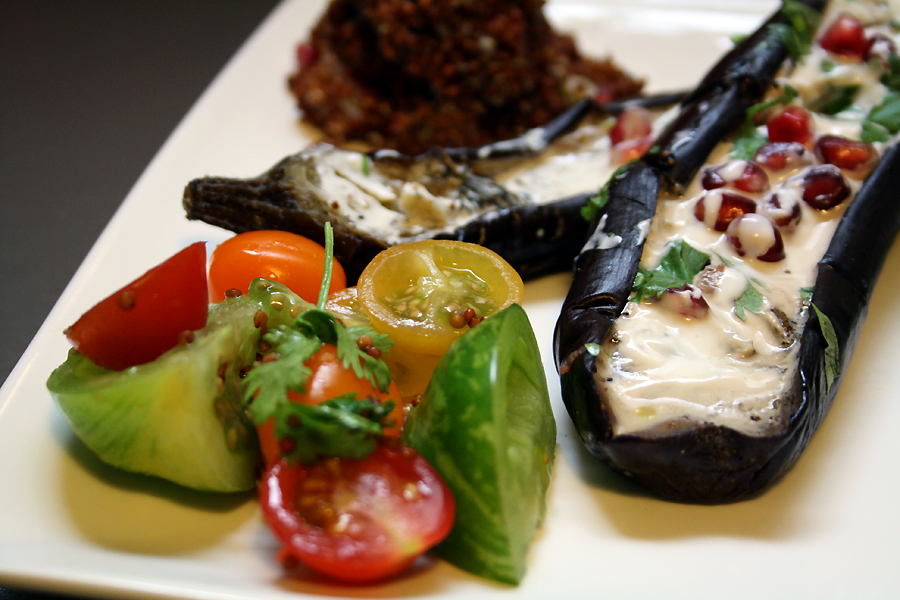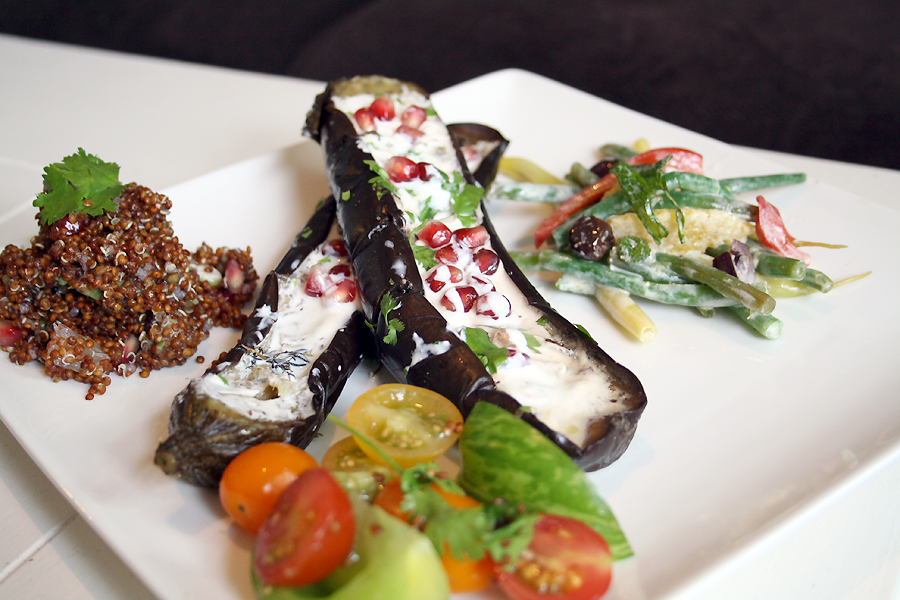 De zaak is gevestigd aan de Haarlemmerstraat 46 HS in Amsterdam, op 10 minuutjes lopen van Amsterdam CS. Wij namen er een vegetarische maaltijd mee (een combinatie van meerdere kleine gerechtjes): gevulde aubergines met een roomsaus en granaatappelpitjes, een tomatensalade (gelukkig eens ’n keer niet alleen maar cherrytomaatjes, hoera!), een bonensalade (ook deze was bijzonder) en quinoa met avocado (superromig) en grote tuinbonen. We waren hier € 12,50 voor kwijt.