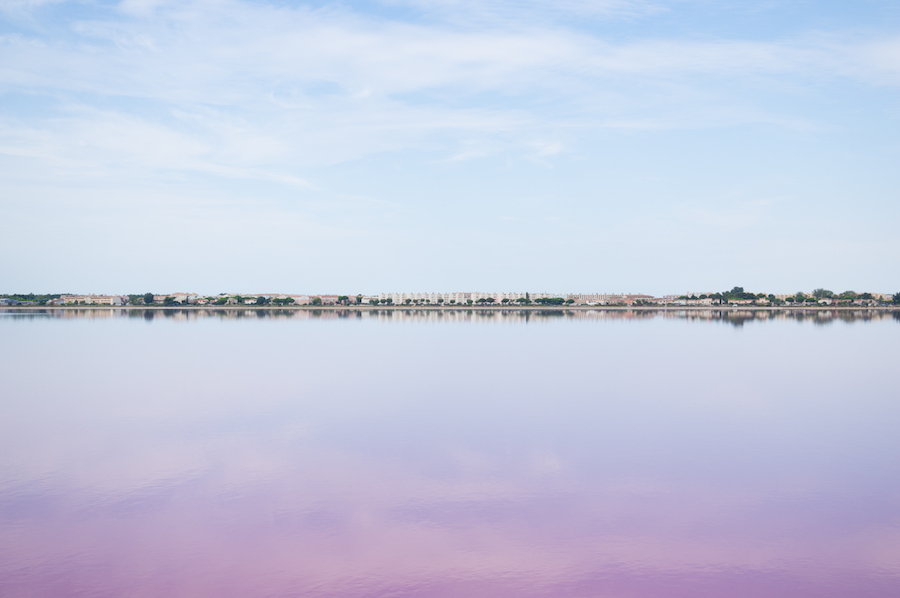 Het meer waar de Fleur de Sel wordt geoogst, strekt zich als een adembenemende roze vlakte voor ons uit, afgesneden door een strakblauwe lucht.