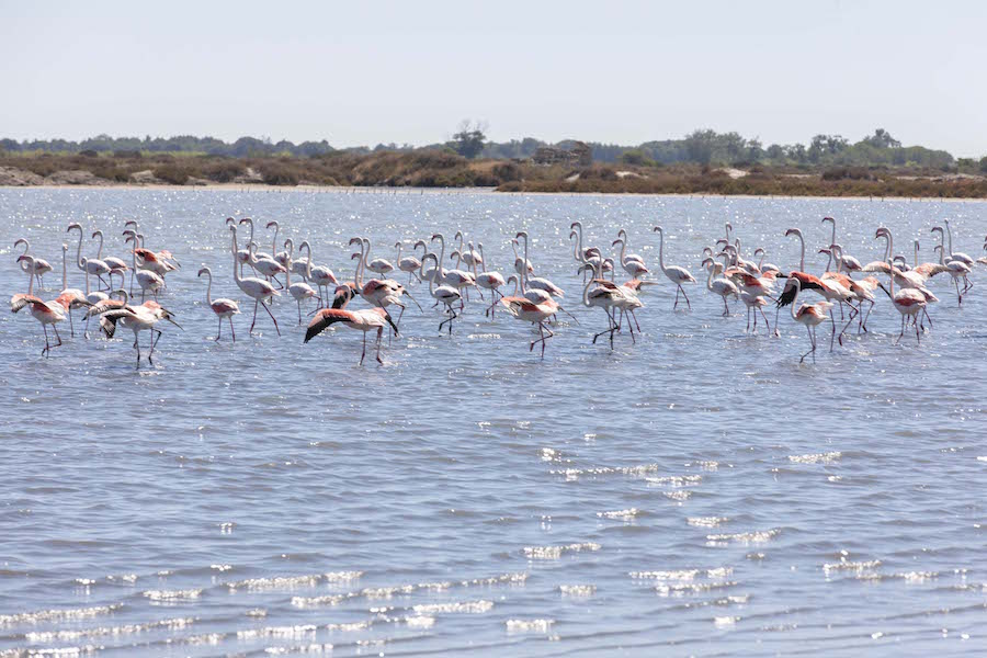 Een leuk weetje om te vertellen op feestjes: flamingo’s worden roze door hun voeding. In de bassins van Aigues-Mortes bevindt zich een alg die bètacaroteen bevat: de Dunaliella Salina. Daardoor kleurt het water roze, maar ook de pekelkreeftjes (Artemia Salina) die hier graag vertoeven. Flamingo’s zijn dol op de kreeftjes en door ze in grote getale te eten, kleuren hun veren roze.