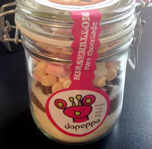 Wij gingen aan de slag met de Koekjespot Marshmallow Pure Chocolade (€ 9,95). Daarin vinden we bloem (eco tarwebloem uit Flevoland), twee soorten suiker (bruine en witte basterdsuiker, afkomstig van suikerbieten uit Groningen), een snufje zout, een vleugje bakpoeder, mini marshmallows en pure chocolate chips. En natuurlijk een recept, geprint op een klein vierkant kaartje.