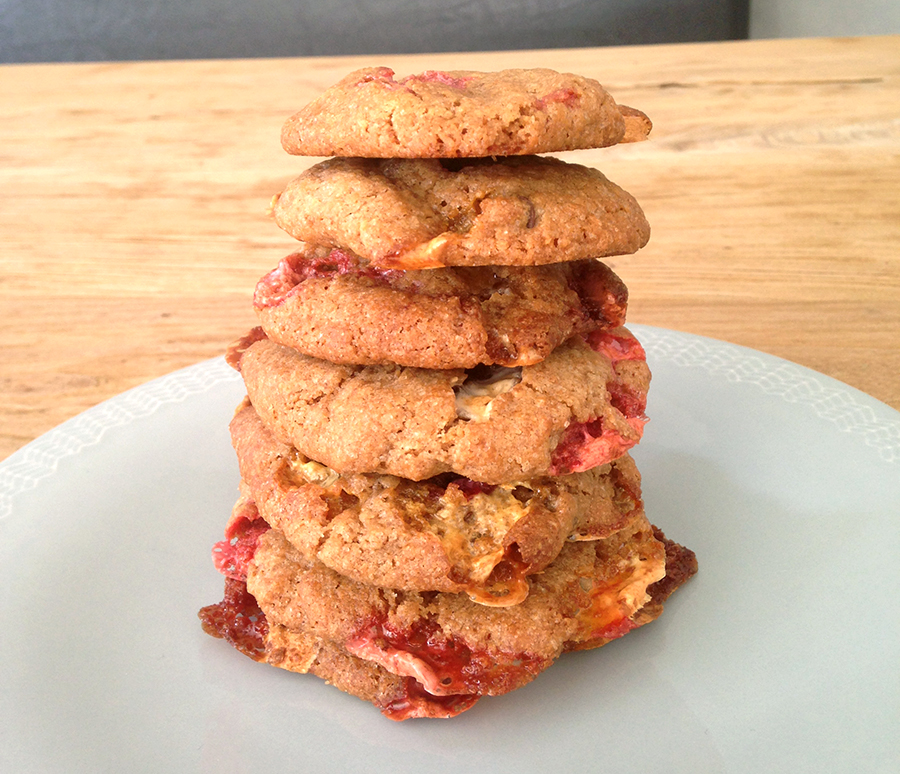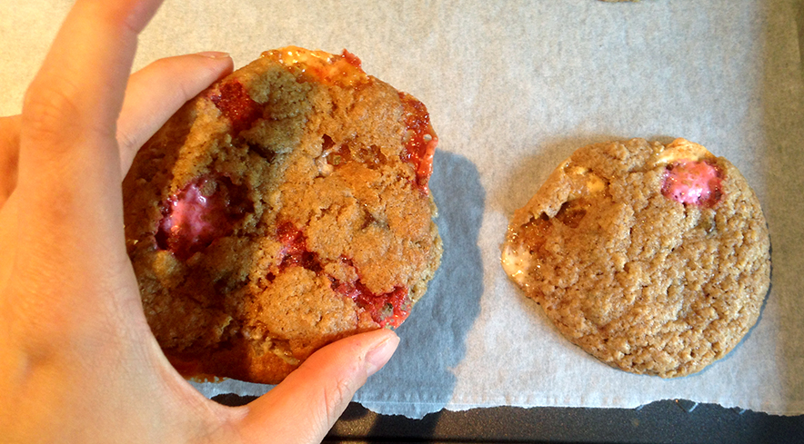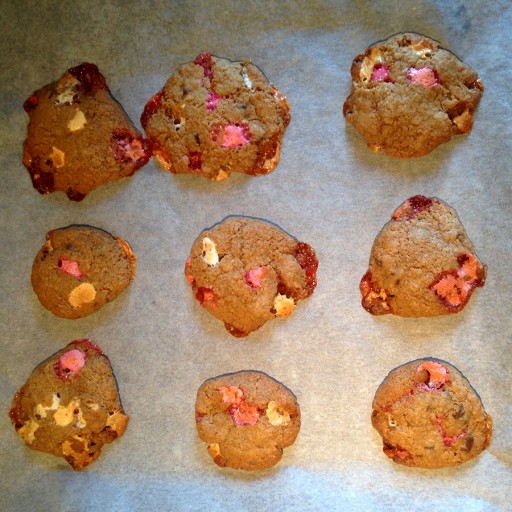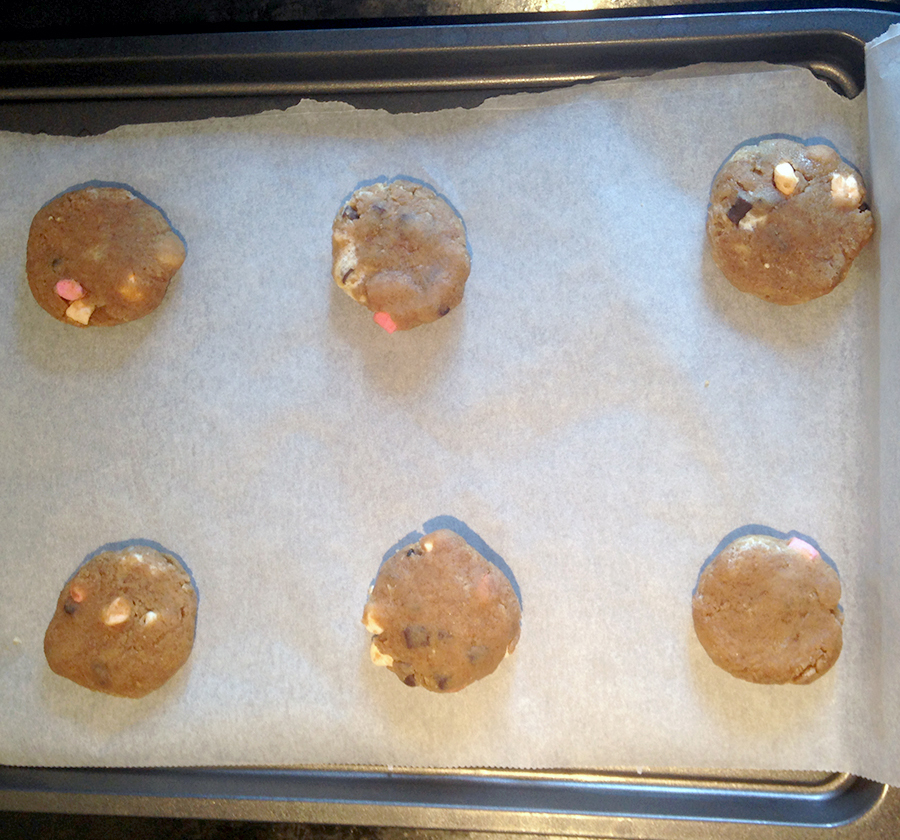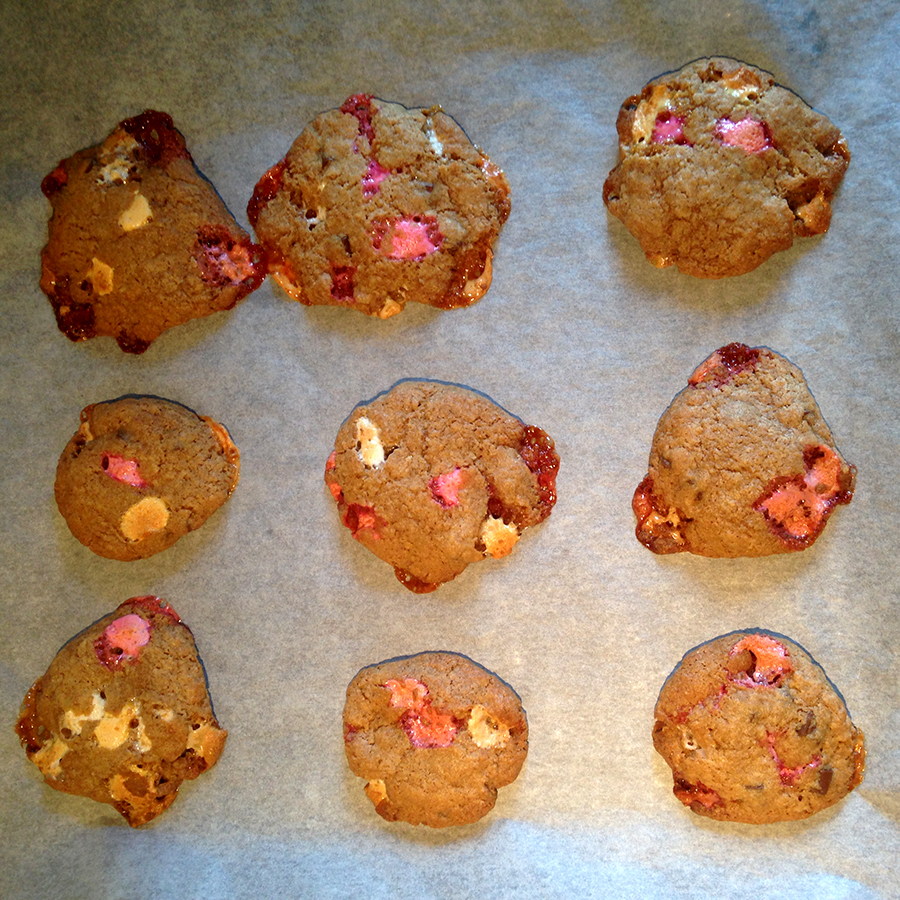Het resultaat: de koekjes zijn flink uitgelopen en hebben daardoor allemaal een beetje een gekke vorm. De marshmallows zijn enorm gesmolten, wat zorgt voor grote blauwe, witte en roze vlekken. De suikers zijn gekaramelliseerd, wat bij sommige koekjes voor een harde karamelrand zorgt. Lekkere koekjes (fijn chewy van binnen), maar ze verdienen niet de schoonheidsprijs.