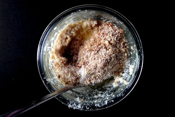 Eerst maar eens pap maken. We gebruiken ons favoriete recept: 1 deel havermout, 2 delen melk – in dit geval gebruiken we amandelmelk. In een pannetje samen met wat kaneel aan de kook brengen, even later doorbubbelen, en dan serveren.