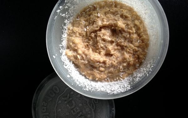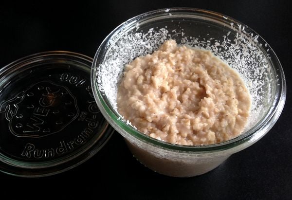 Wij laten de pap iets afkoelen, sprayen de binnenkant van de weckpot in met een klein beetje bakspray en ‘bestuiven’ het vervolgens met wat kokosrasp: onze bedoeling hiermee was dat de bevroren pap zo beter los zou laten. Maar wat bleek na een nachtje in de vriezer: het harde ‘stuk’ pap zit muur- en muurvast. De volgende keer gaan we voor een andere tactiek: toch invriezen in een (siliconen) muffinbakvorm, een uurtje ‘aanvriezen’ in de vriezer, dan loshalen uit de vorm en in een plastic zakje in de vriezer doen. Zo zit je de volgende ochtend niet te bikken om de pap uit het bakje te krijgen.