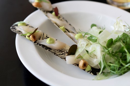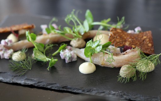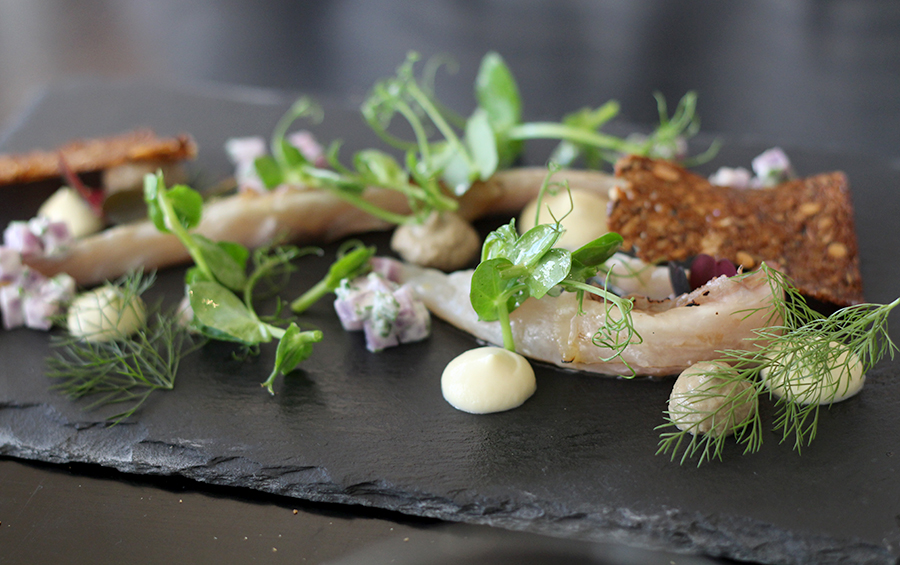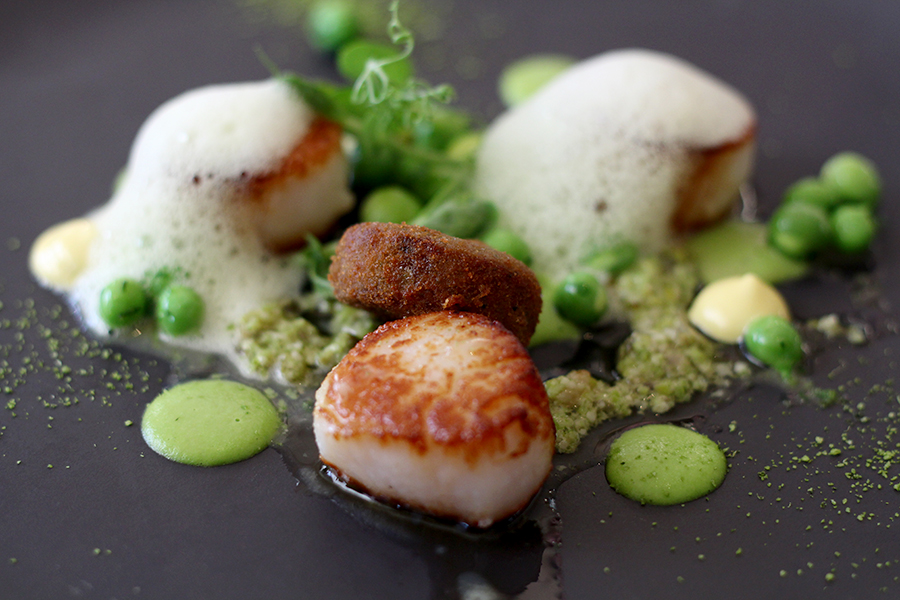 Het menu is overzichtelijk en staat vol verrassende combinaties. Scheermesjes in een eetbare ‘schelp’ met hazelnootcrumble. Coquilles met doperwtjes, schuim van daslook en een krokant koekje van varkenshoofd (!) met wasabi. Makreel met truffelaardappeltjes, spek en roggebrood.