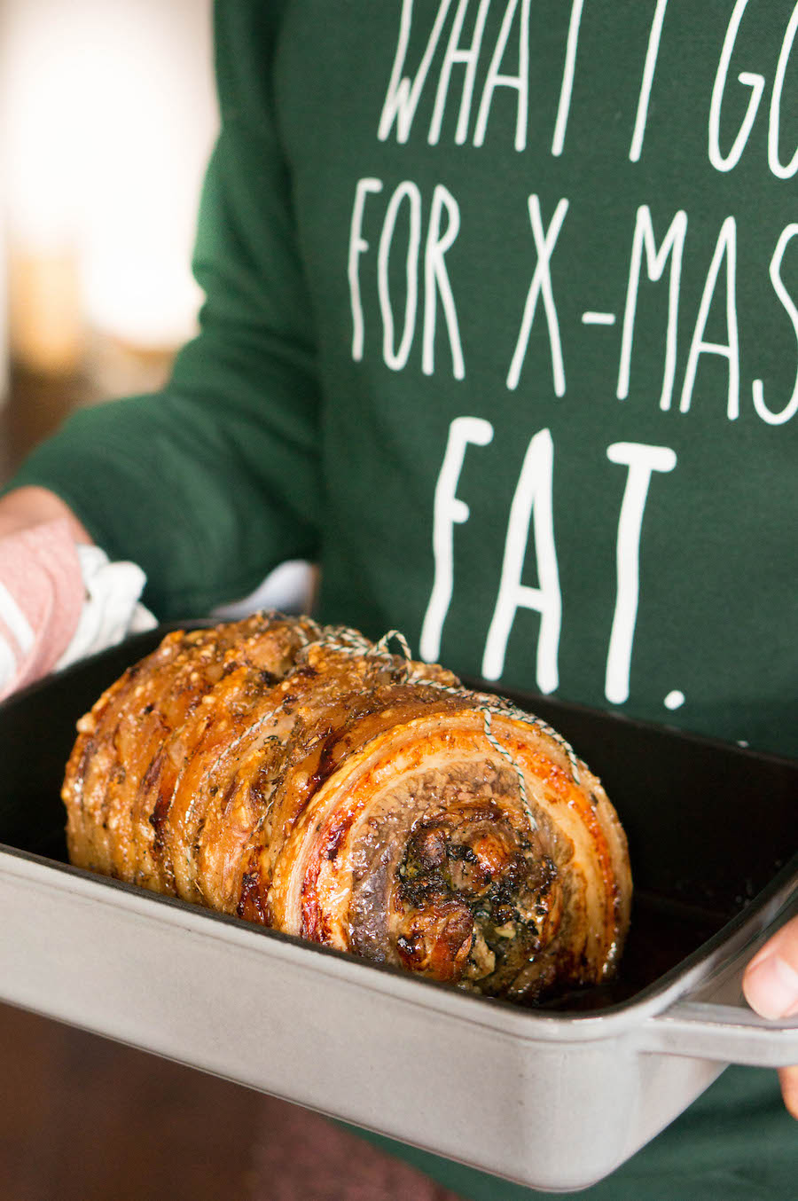 Hij moet een flinke tijd in de oven, deze porchetta voor Kerst. Maar dan heb je ook een spektakelstuk. En handig: hij is zowel warm als koud lekker.